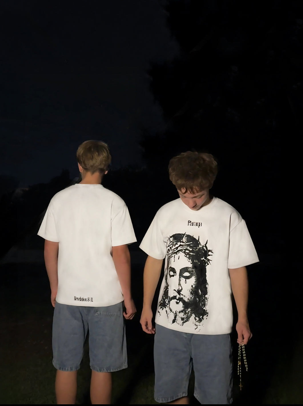 This piece features a bold black graphic of Jesus crowned with thorns, eyes steady, heavy with meaning. Above His image rests the Paraqa logo. On the back hem, a quiet reference: Revelation 8–11.