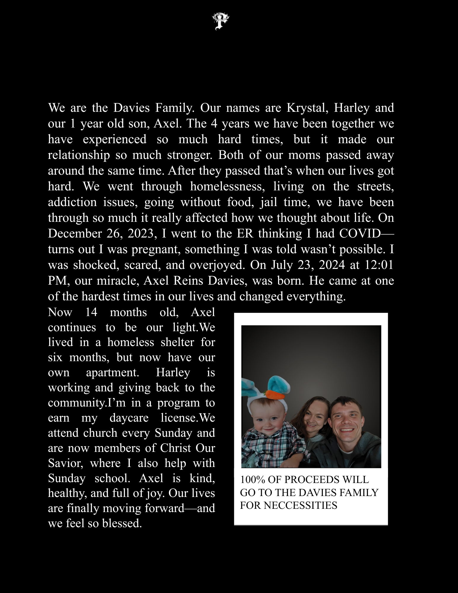 100% of net proceeds go directly to the Davies Family as they continue rebuilding their lives and sharing their faith!